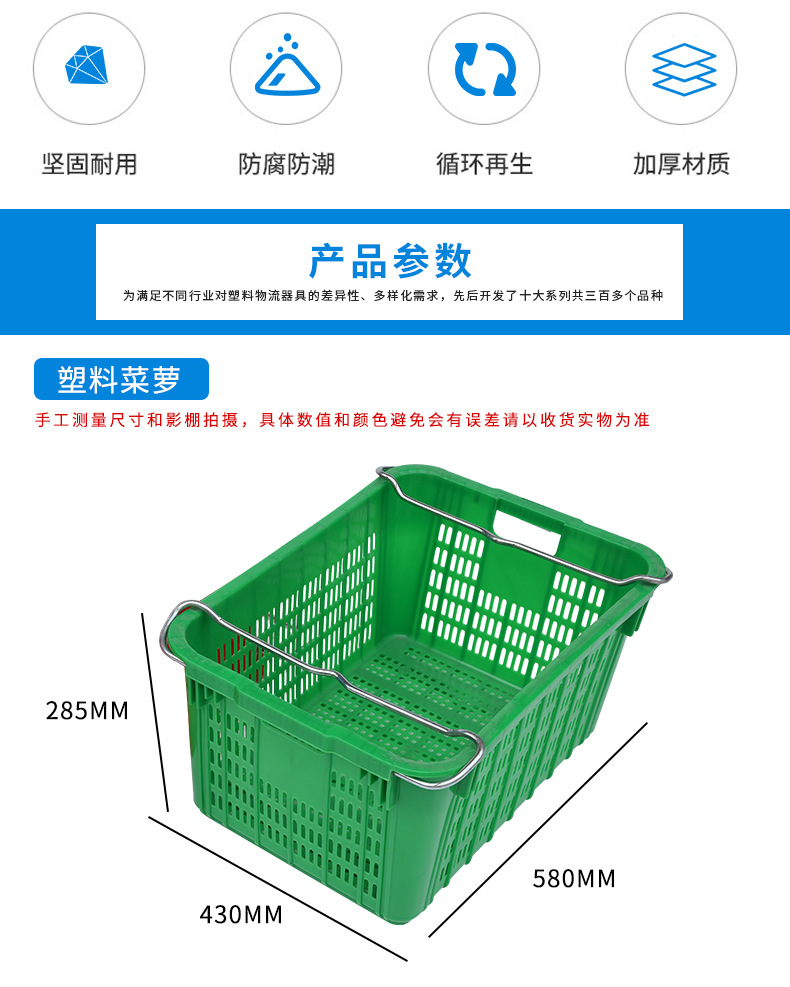 工藝優(yōu)勢 :注塑一(yī)體(tǐ)成型,壁厚2-6mm,耐用性遠超普通塑料(liào)筐。