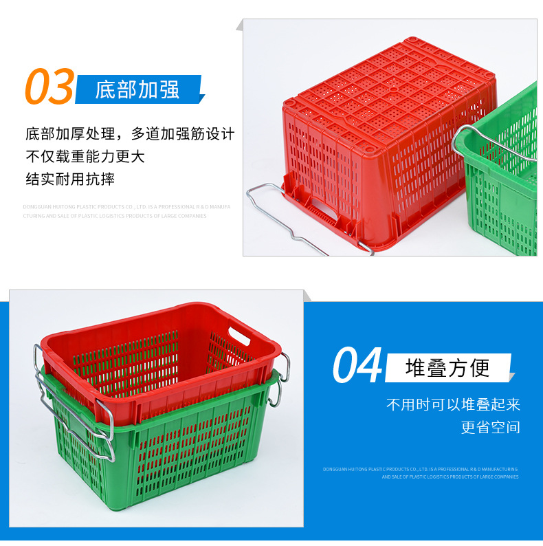鐵耳蔬(shū)果(guǒ)塑料筐(kuāng)采用全新PE/PP塑料(100%新料),具有抗摔、耐磨損、韌性強等特點,確保長期重複使用。